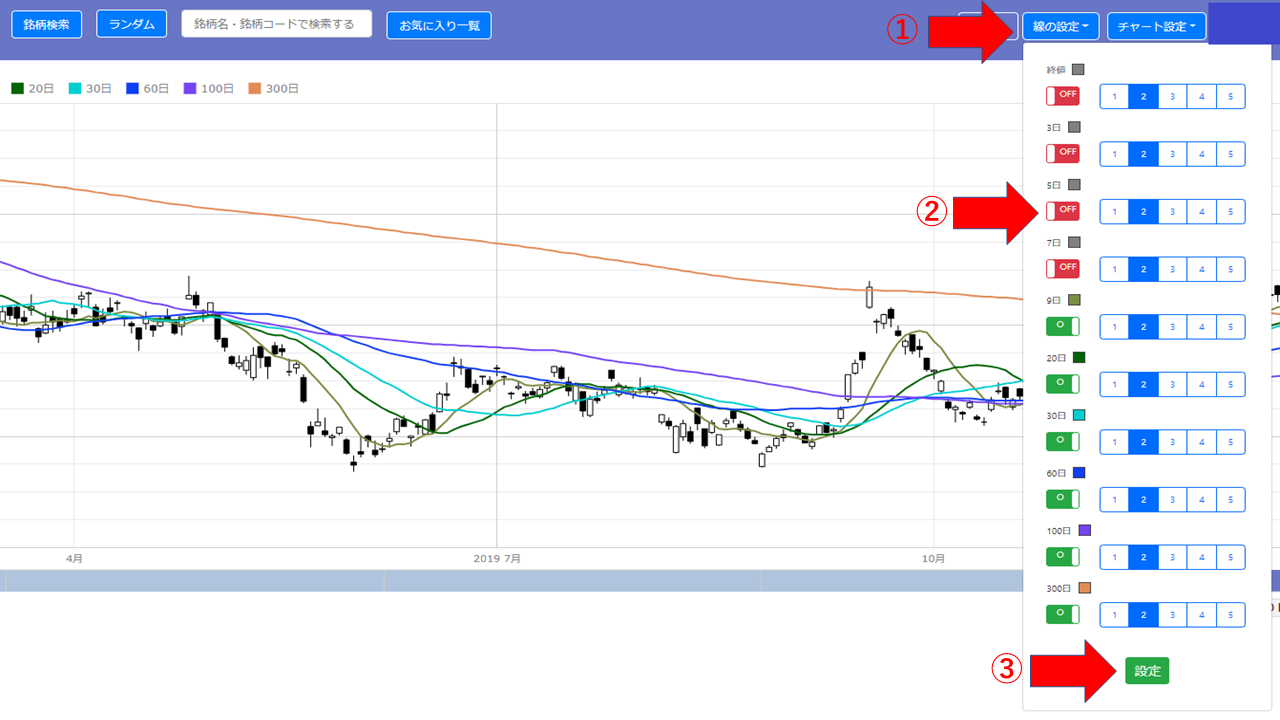 非表示にしたい移動平均線を②の部分をクリックして<OFF>にし、最後に③<設定>を押してください。